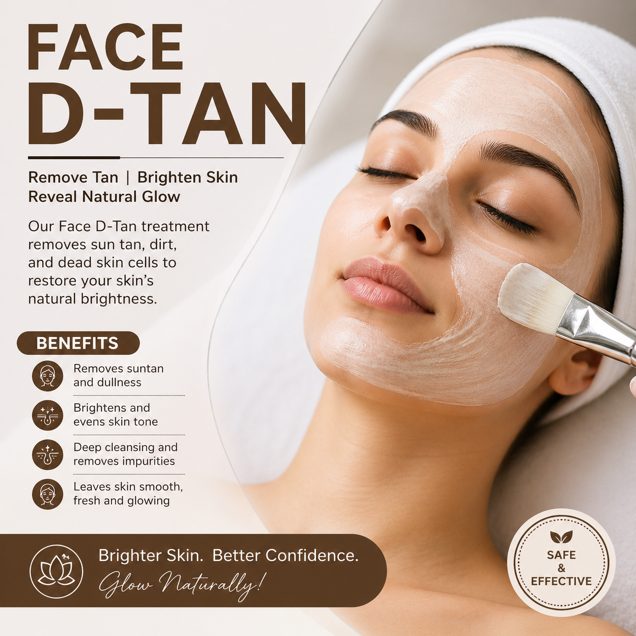 Benefits of our Face D Tan Treatment include removal of dead skin cells, brighter complexion, smoother skin, reduced tanning, and refreshed appearance. We focus on safe skincare solutions that bring long-lasting glow and confidence.