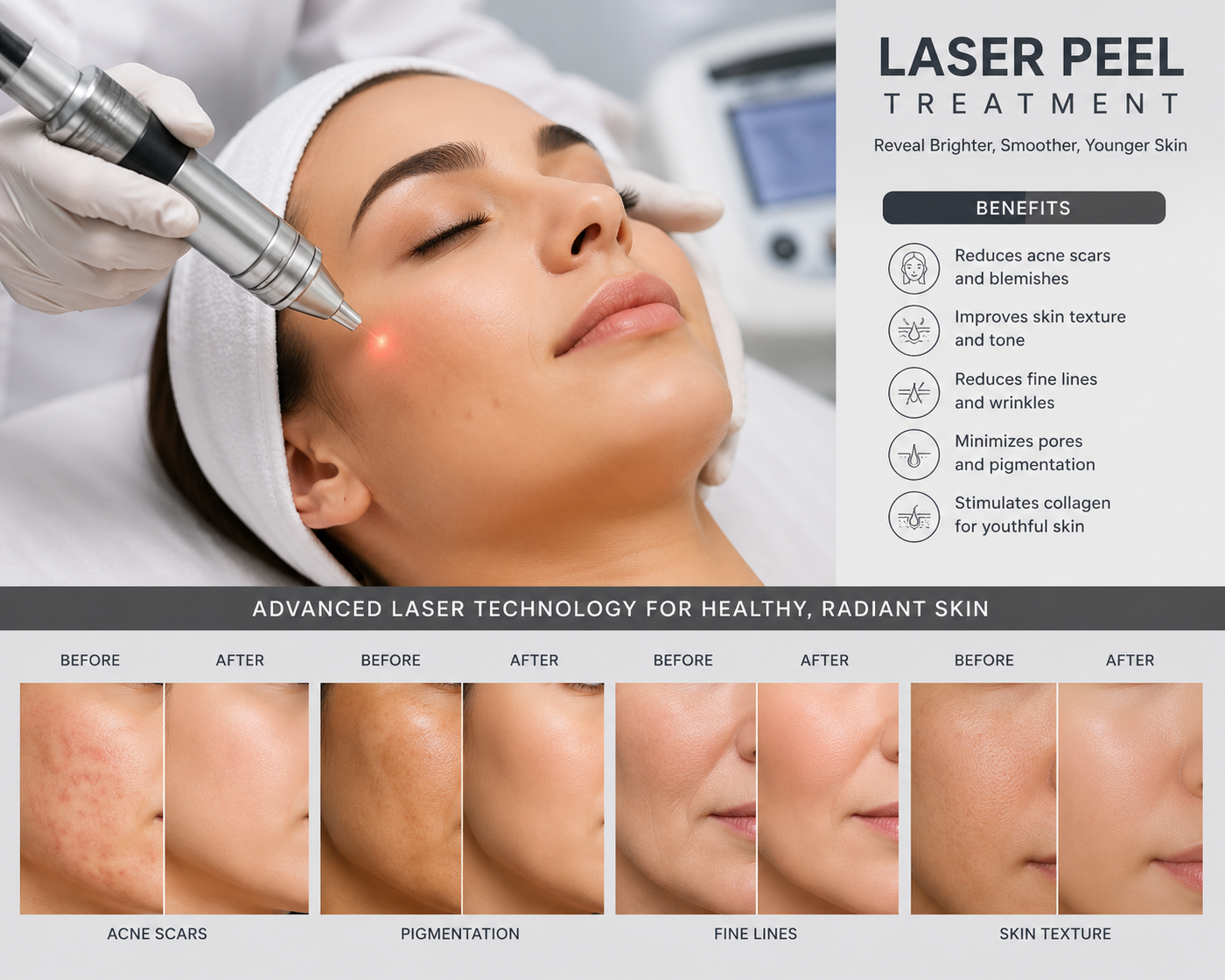 Our customized Laser Skin Peel Treatment is suitable for both men and women looking for radiant and refreshed skin. Whether you want to improve acne marks, wrinkles, enlarged pores, tanning, or skin discoloration, we create personalized treatment plans based on your skin type and concerns.